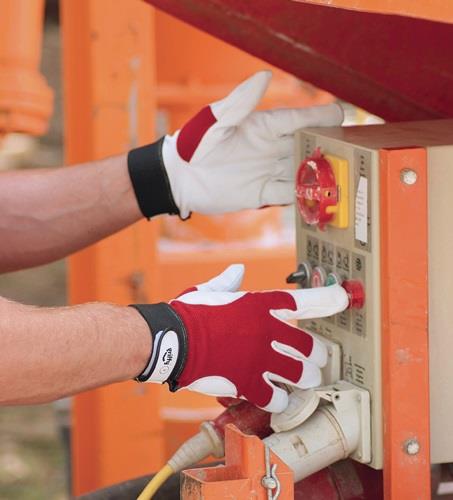 nach EN 388 · Kat. II · Material: robustes und geschmeidiges Ziegennappaleder · mit rotem Interlock-Handrücken · passgerechte Stulpe mit Klettverschluss · ausgesuchte Lederqualitäten · erstklassige Griffsicherheit und Tastgefühl · zertifiziert nach OEKO-TEX LEATHER STANDARD · paarweise an SB-Karte