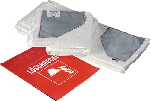aus texturiertem E-Glasgewebe mit seitlichen Grifftaschen auf der 1600-mm-Seite · verpackt in rotem Beutel · Schnittkanten gesäumt · Löschdecke nach DIN EN 1869