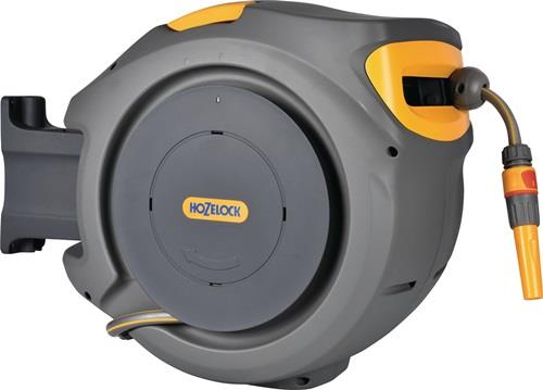 Wandschlauchbox mit Aufrollautomatik · inkl. Premiumschlauch und 2 m Zulaufschlauch, 1 x Spritzdüse, 1 x Schlauchkupplung, 1 x Aquastop Schlauchkupplung, 1 x Hahnanschluss für 3/4? und 1/2? · inkl. Wandbefestigung